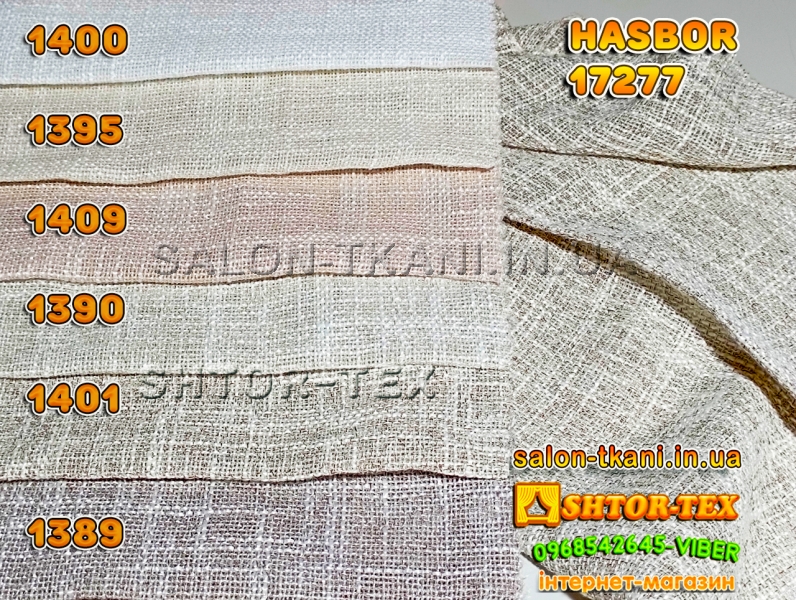 У нас Ви можете купити шторну тканину HASBOR 17277 1400,1395,1409,1390,1401,1389 гуртом та в роздріб від 1м за самою кращею ціною. У нас представлені HASBOR тюль мирових брендів, в докладних каталогах та з якістними фото.Ми пропонуємо відмінну якість за ціною виробника.Працюємо по всій Україні: Київ, Дніпро, Запоріжжя, Харьків, Одеса, Миколаїв, Вінниця, Житомир, Івано-Франківськ, Кропівницький, Полтава, Суми, Тернопіль, Чернівці, Чернігів, Херсон, Львів, Рівне, Ужгород...