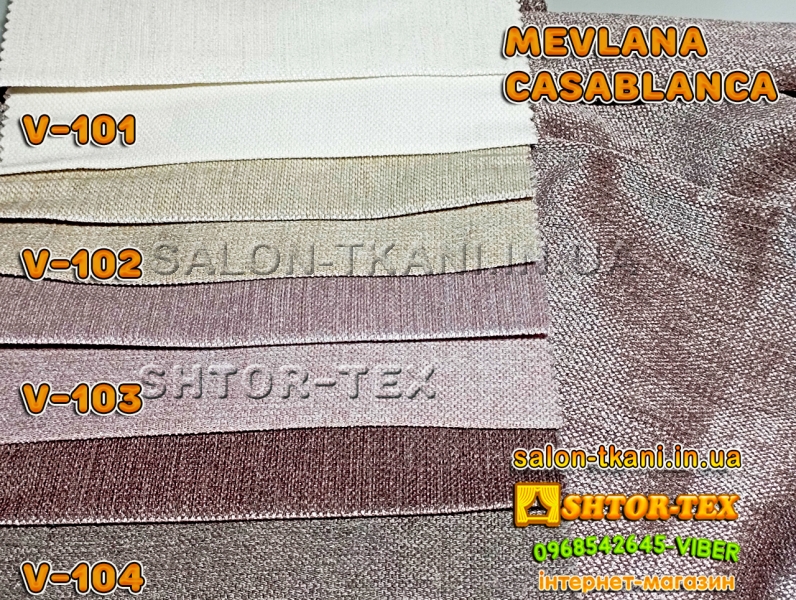 У нас Ви можете купити шторну тканину MEVLANA CASABLANCA V-101,V-102,V-103,V-104 гуртом та в роздріб від 1м за самою кращею ціною. У нас представлені MEVLANA мирових брендів, в докладних каталогах та з якістними фото.Ми пропонуємо відмінну якість за ціною виробника.Працюємо по всій Україні: Київ, Дніпро, Запоріжжя, Харьків, Одеса, Миколаїв, Вінниця, Житомир, Івано-Франківськ, Кропівницький, Полтава, Суми, Тернопіль, Чернівці, Чернігів, Херсон, Львів, Рівне, Ужгород...