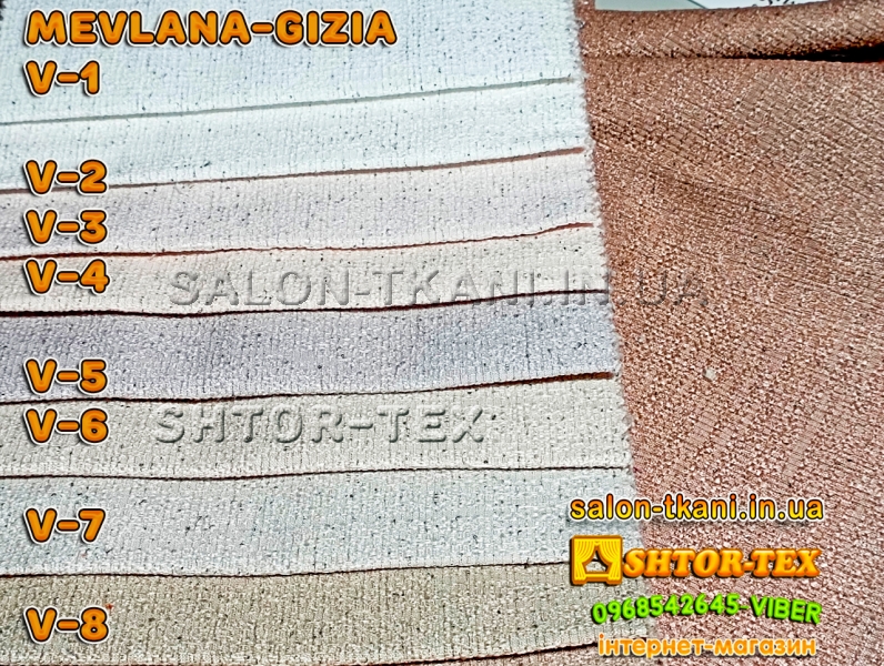 У нас Ви можете купити шторну тканину MEVLANA GIZIA V-1,V-2,V-3,V-4,V-5,V-6,V-7,V-8 гуртом та в роздріб від 1м за самою кращею ціною. У нас представлені MEVLANA мирових брендів, в докладних каталогах та з якістними фото.Ми пропонуємо відмінну якість за ціною виробника.Працюємо по всій Україні: Київ, Дніпро, Запоріжжя, Харьків, Одеса, Миколаїв, Вінниця, Житомир, Івано-Франківськ, Кропівницький, Полтава, Суми, Тернопіль, Чернівці, Чернігів, Херсон, Львів, Рівне, Ужгород...