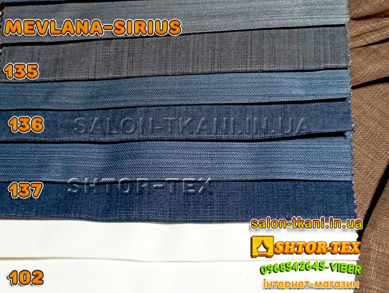 У нас Ви можете купити шторну тканину MEVLANA SIRIUS 135,136,137,102 гуртом та в роздріб від 1м за самою кращею ціною. У нас представлені MEVLANA мирових брендів, в докладних каталогах та з якістними фото.Ми пропонуємо відмінну якість за ціною виробника.Працюємо по всій Україні: Київ, Дніпро, Запоріжжя, Харьків, Одеса, Миколаїв, Вінниця, Житомир, Івано-Франківськ, Кропівницький, Полтава, Суми, Тернопіль, Чернівці, Чернігів, Херсон, Львів, Рівне, Ужгород...